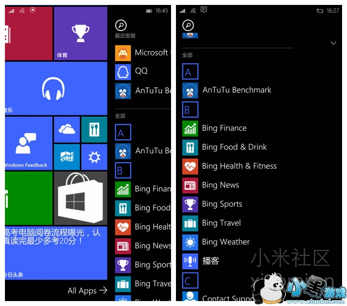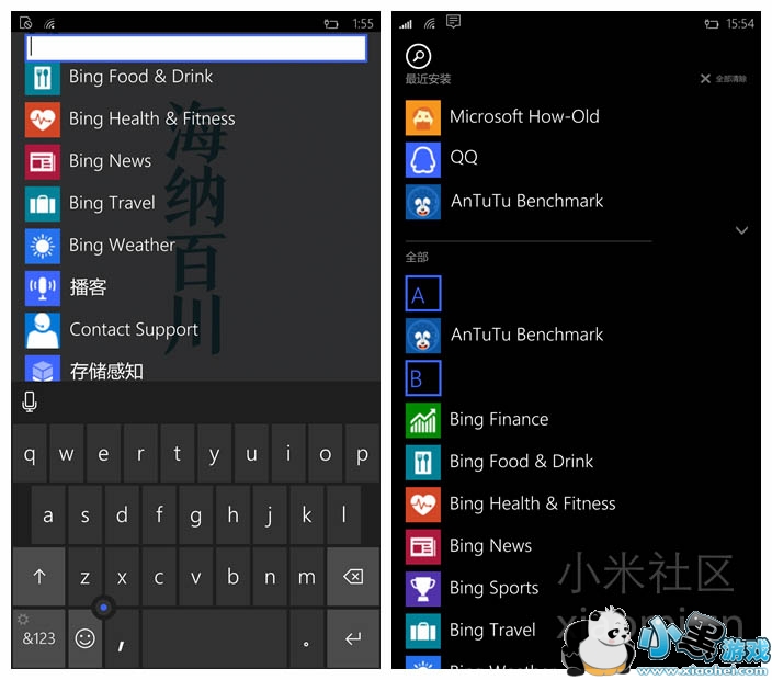 在系统桌面状态下左划即可进入应用列表页,Win10版小米4的应用列表默认是按应用首字母排序的,在这里你可以找到系统内置以及近期安装过的所有APP。