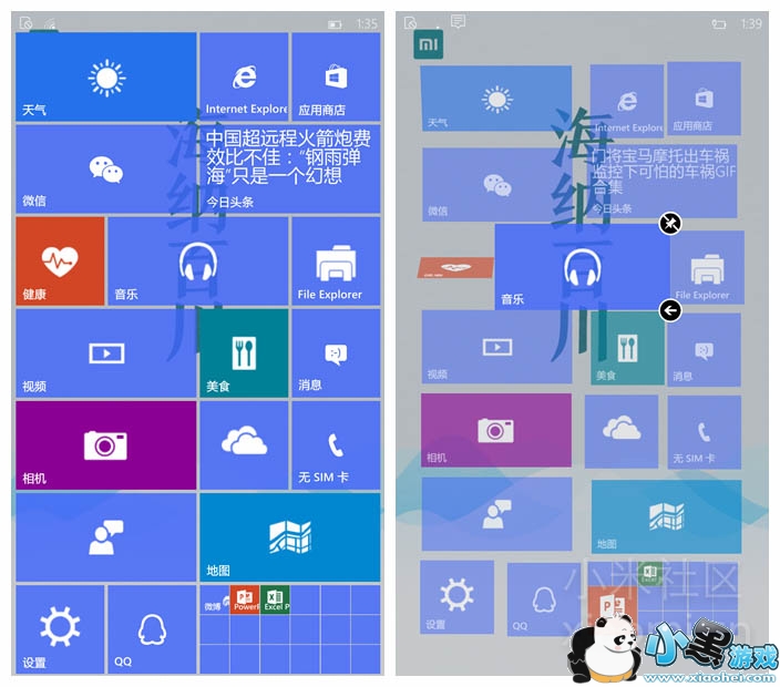 Win10版小米4的桌面看上去和之前一样,依然采用“瓷贴式”设计,没有改变微软系列手机的经典特色。然而有所不同的是本次更新新增了几款瓷贴的样式。在这样的桌面上任由你发挥,喜欢将某个图标放大或者缩小,将APP列表的图标添加到桌面,或者集成文件夹都可以。