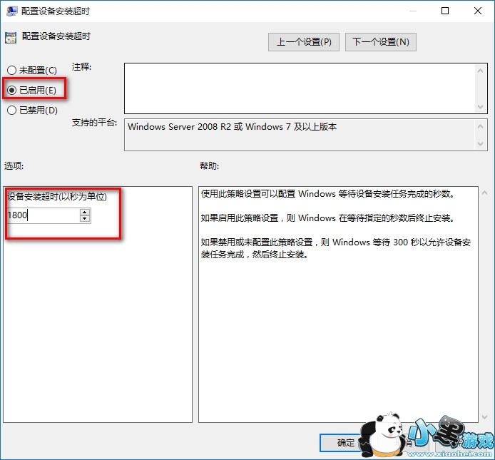 ▲ 选择已启用,将默认的超时时间从300秒更改为1800秒,点击确定。