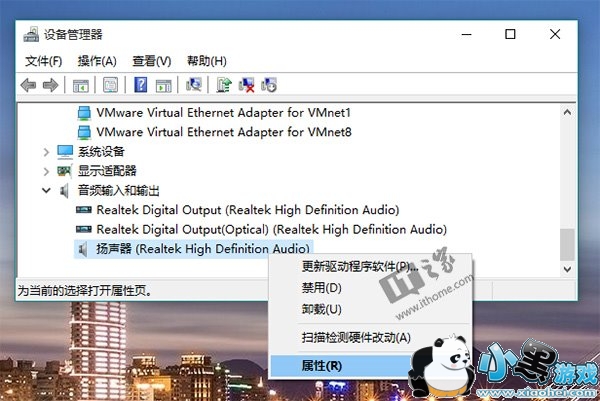 ▲ 找到“声音输入和输出”,右键单击默认声音输出设备,选择属性。