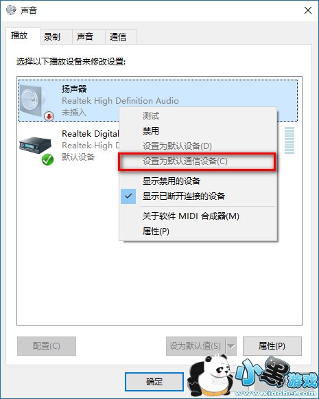 ▲选择合适的设备作为默认通信设备(此处作为演示,演示设备未使用VIA声卡)设置好默认通信设备后,再打开设备属性(上图右键菜单):