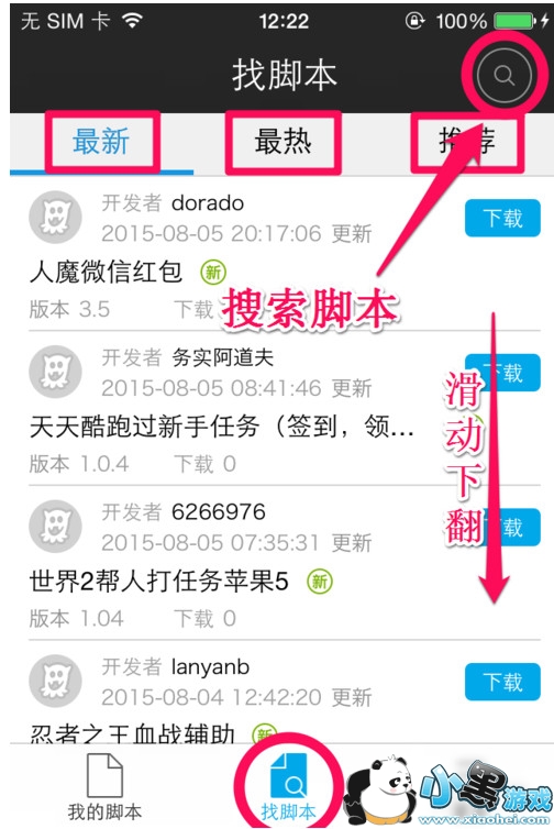 打开触动精灵点击正下方中间的“找脚本”图标。点击后进入下图,您可以在此寻找您需要的脚本。
