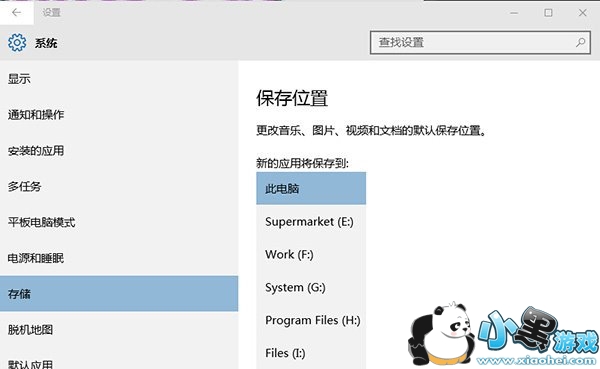 打开设置——系统——存储,会在右侧看到“保存位置”设置,在这里你可以设置将应用安装到其他分区,甚至是移动存储设备(包括移动硬盘或者U盘),不过不能安装到网络驱动器。