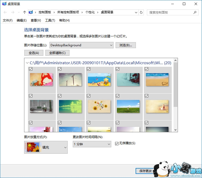 打开后就可以像Win7/Win8.1那样设置桌面背景了,而且“壁纸自动换”功能也可以正常使用,非常方便。需要提醒各位的是,每次打开这个窗口都需要采用上述方式,将该窗口固定到任务栏后,再次打开时只会显示控制面板。