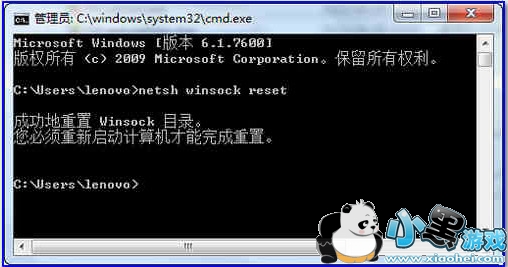 b.在命令提示符处键入 netsh winsock reset,然后按 Enter,重启电脑。