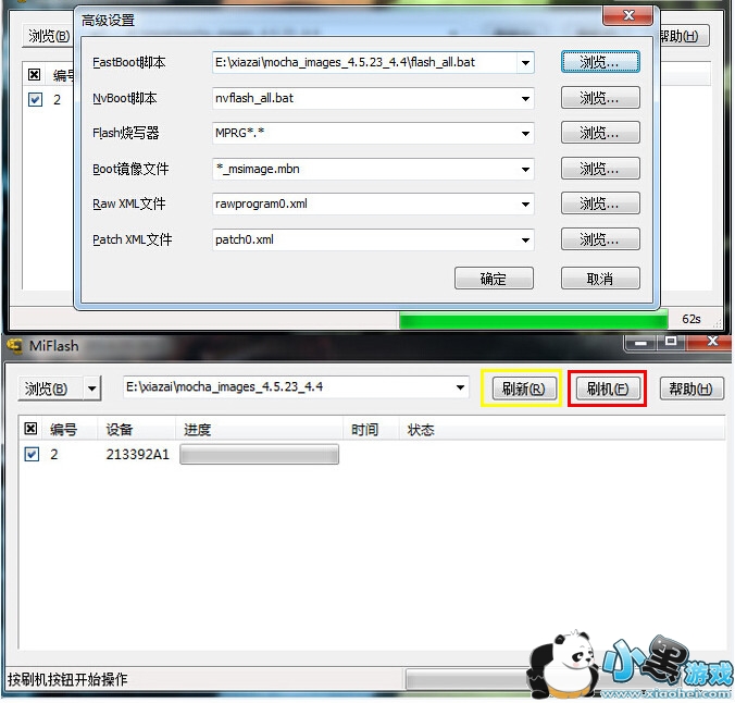 点击黄色圈选部分刷新,刷机程序会自动识别手机,点击浏览旁的向下箭头,选择高级设置--选择fastboot刷机脚本为ROM路径中flash_all.bat,点击红色圈选部分刷机开始刷机。