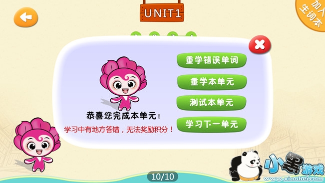 学完每个单元完成之后,针对学习过程中的错误单词,可以加强练习,也会提示测试整个单元。