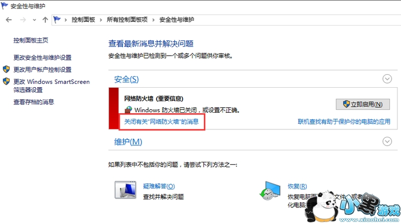 打开安全性与维护界面后,安全菜单里会有网络防火墙的信息,点击关闭有关“网络防火墙”的消息;关闭后就不会再有通知了