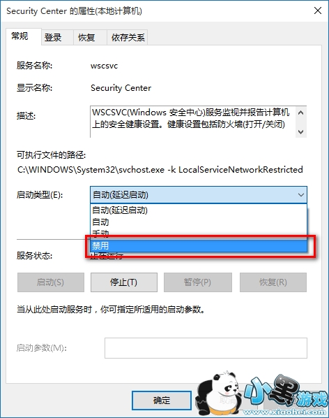 3、双击打开SecurityCenter属性,停止该服务并设置启动类型为“禁用”;