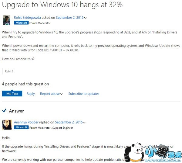 微软社区的一位论坛版主、支持工程师Anannya Podder对此问题给出了解决方案,称该问题是由不兼容的驱动或者硬件所导致。她表示,微软目前正在与相关硬件厂商合作,争取早日解决各种兼容性问题。