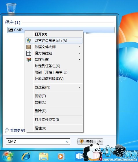 ① 在搜索框中输入CMD后,选择第一个结果,并在上面单击右键选择“以管理员身份运行”,如下图——