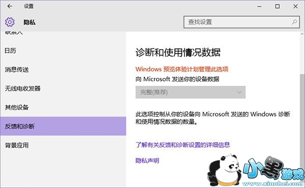 微软要求参与预览版计划的用户,需向微软发送完整的诊断和使用情况数据。升级预览版后,该选项将自动设置为“完整”,且不可更改。如下图所示: