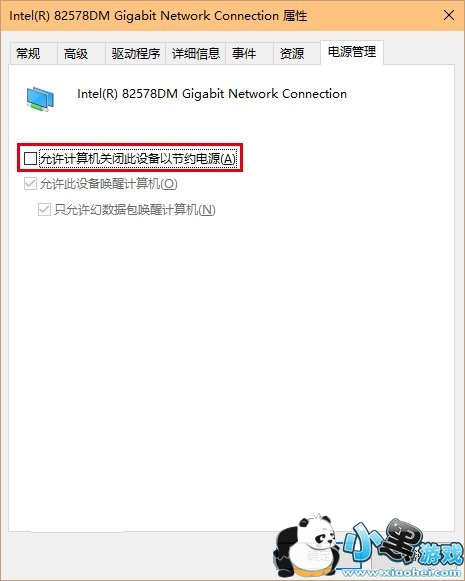3、点击“电源管理”选项卡,取消勾选“允许计算机关闭此设备以节约电源”后点击确定,如下图——