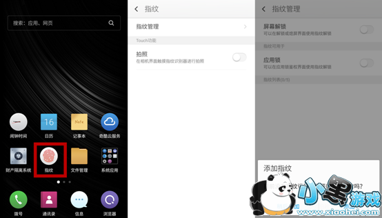 8、指纹功能是360奇酷手机的卖点之一。点击进入后可选择除了【指纹解锁】功能外是否开启【指纹拍照】功能。点击【指纹管理】添加新指纹。