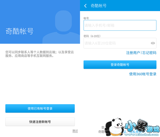 3、登陆奇酷账号。如已有奇酷账号或360账号可选择【使用已有账号登陆】。如果没有,点击【快速注册新账号】。也可点击【跳过】,跳过此步骤。