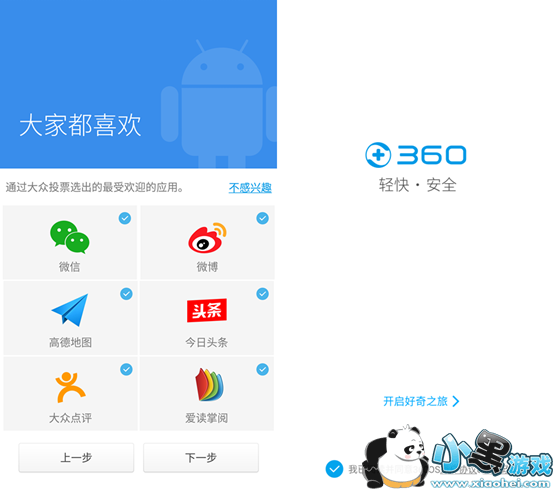 4、设置完账户进入下一步,系统会向用户推荐通过大众投票选出来的最受欢迎应用,包括微信、微博、今日头条等。可选择自己喜欢的应用,之后系统会将该应用下载安装至手机。如想跳过此步骤,点击【不感兴趣】。设置完成后,进入手机主界面。