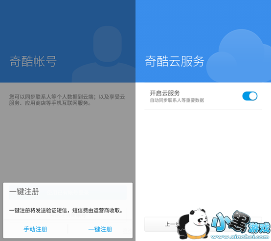 在注册界面,可以手动注册,输入账号、密码。也可选择【一键注册】,用手机号注册账号,奇酷会向该手机号码发送验证码,验证后完成注册。