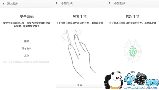 添加新指纹首先需要设置安全密码,方面指纹识别有误后,帮助解锁或密码找回。可选择解锁图案、简单数字或数字字母组合的复杂密码。