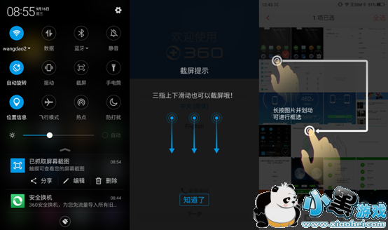 还有一些小技巧。用户可通过下拉的【快速功能栏】进行包括开关热点、开关定位、切换模式、截屏等操作。