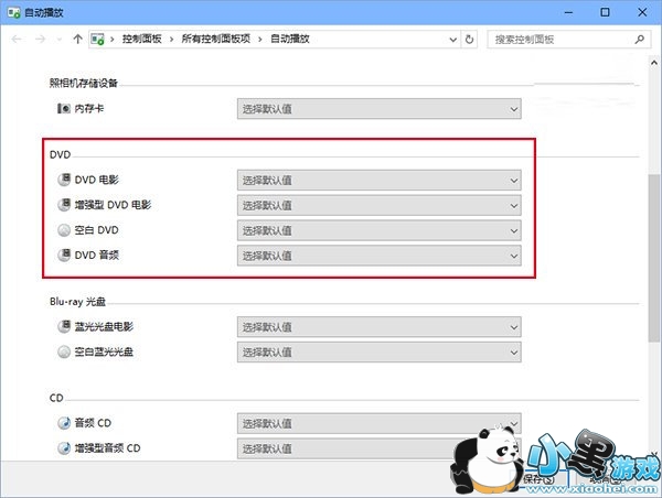 ② 找到“DVD”相关项目(共四项),都选择“Play DVD(Windows DVD Player)”