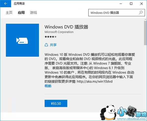 由于DVD光盘播放功能已经日渐被人遗忘,因此微软在Win10中移除了这一功能。不过微软并非将其一棒子打死,而是推出了一款Windows10版DVD播放器作为“补救措施”。但这款应用并非免费使用,中国用户需支付93.5元才可购买使用。