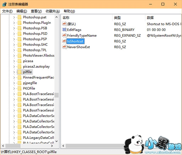 3、再定位到 HKEY_CLASSES_ROOT/piffile,按照第二步的方法再建一个字符串值,仍命名为 IsShortcut,如下图——