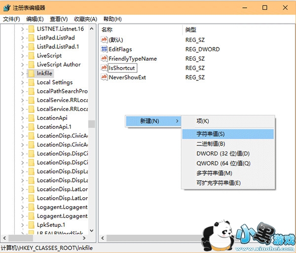 2、定位到 HKEY_CLASSES_ROOT/lnkfile,在右侧空白处右键单击,新建→字符串值,重命名为 IsShortcut,数值数据留空(不必修改)即可,如下图——