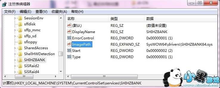 请点击开始-运行,输入regedit打开注册表后定位到HKEY_LOCAL_MACHINE/SYSTEM/CurrentControlSet/Services下,点击编辑-查找,输入shihzbank64.sys,搜索到的键中ImagePath字段就是驱动文件具体目录,如图所示