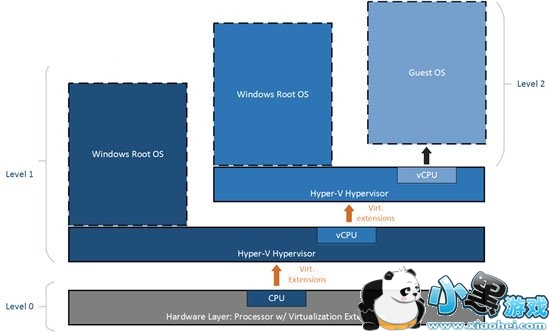 而在最新版本中,宿主机的Hyper-V虚拟机监控程序则对客户机开放虚拟化扩展功能,因此客户机也可以拥有自己的虚拟机。
