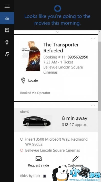 Cortana还增加了电影预订和重要事件提醒功能,通过确认电子邮件进行识别。在事件发生两小时之前,你会得到与之相关的更多帮助信息,比如,Cortana能够帮你通过Uber叫车。