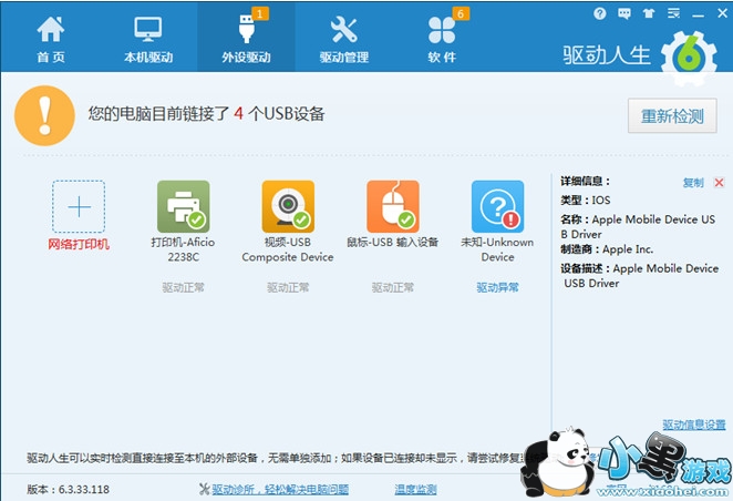 点击打开外设驱动界面,可以看到,电脑所有外部接入的usb输入设备,都会出现在了这个界面。点击某个设备,都可以查看设备的信息,对于外设设备的管理方便、快捷。如某个外设设备驱动出现异常,都会有相应提示。如iPhone 6S插入电脑识别不了时,即会有感叹号提示,只需点击“修复驱动”,根据相应提示操作即可。