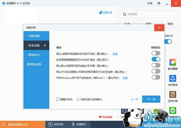 在魔方主窗口中点击“设置向导”,然后在“安全加固”中将UAC关闭即可
