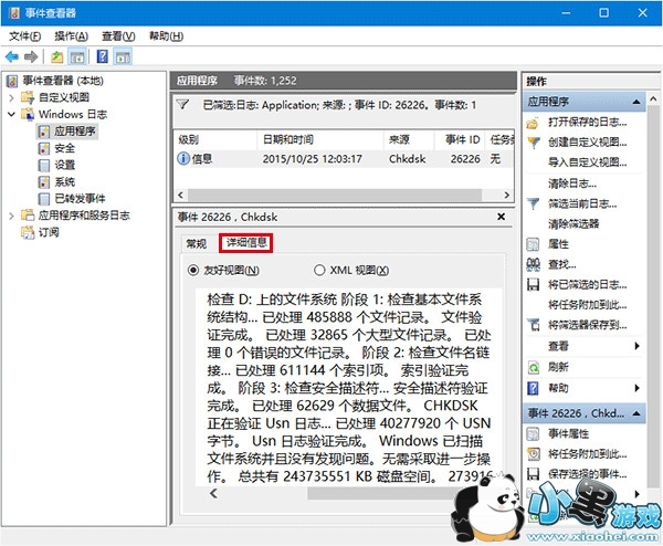 4、在“事件查看器”主窗口中间就可以看到目前已有的日志。单击所需日志,下方就会给出该日志信息,此时点击“详细信息”可查看日志内容。