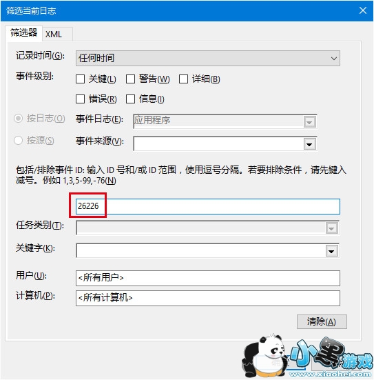 3、在窗口正中间一行输入事件ID“26226”,点击“确定”,如下图