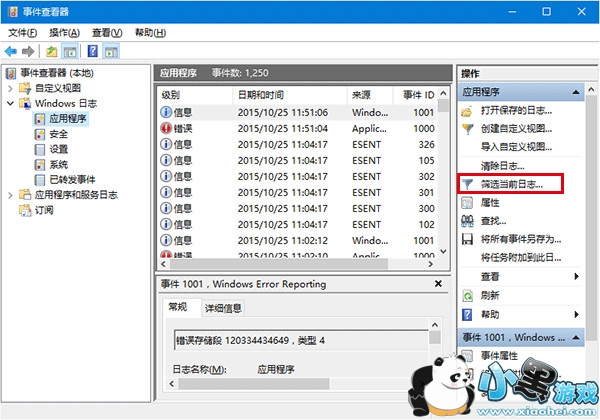 2、在左边栏展开“Windows日志”,选择“应用程序”,从右边栏选择“筛选当前日志”,如下图