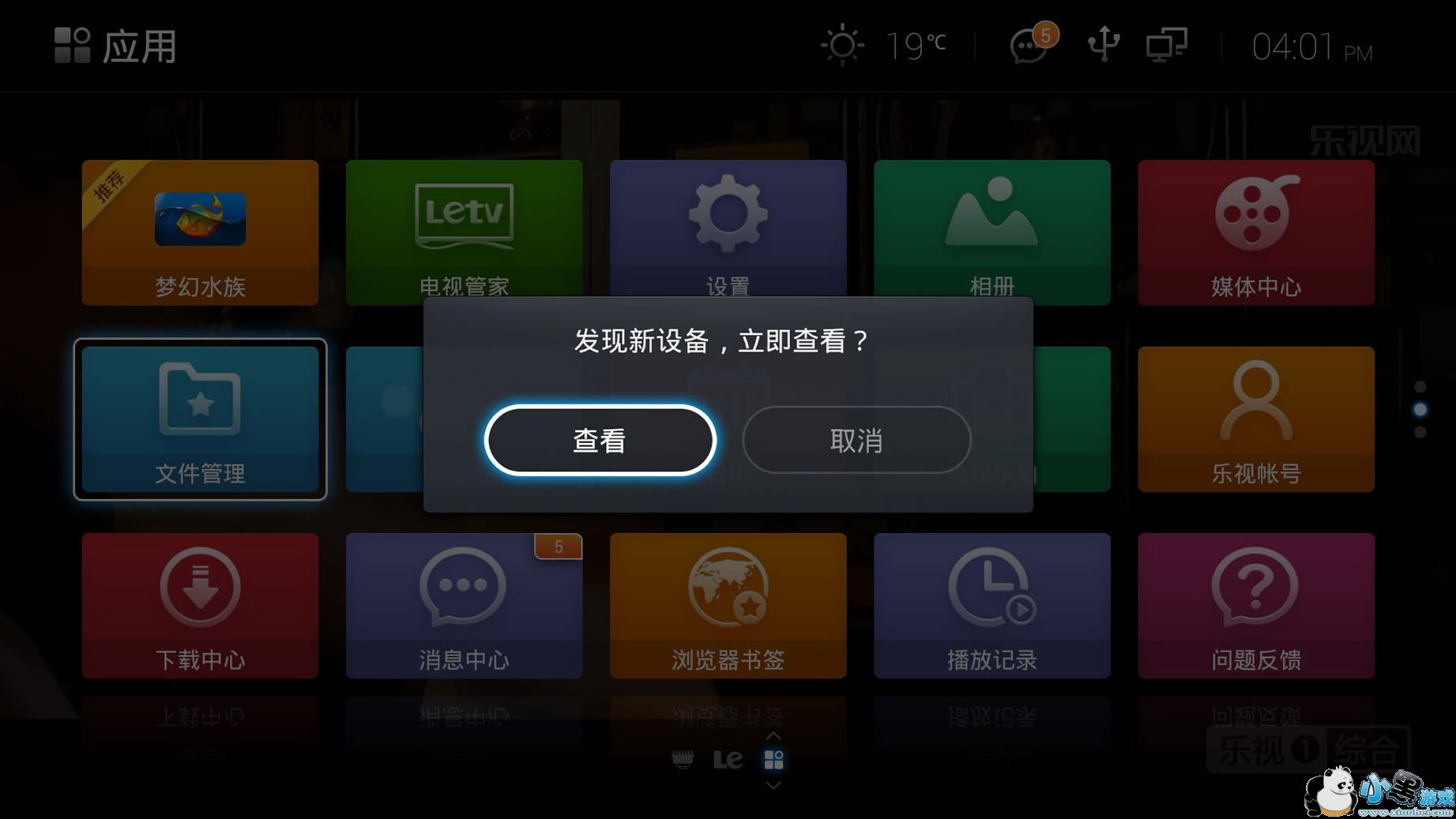 二、我们将电视通电开机,找到电视的USB接口,然后将存有APK应用文件的U盘插上,一般此时都会自动弹出提示,点击“查看”;