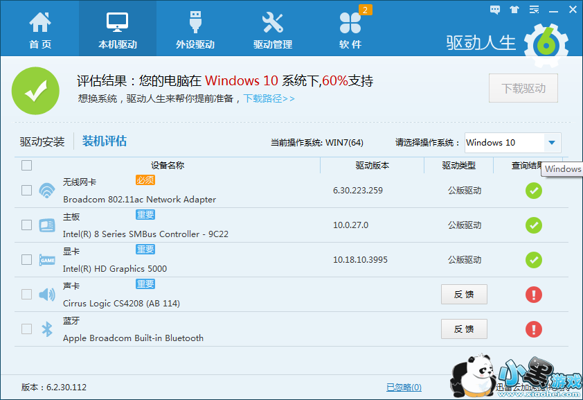 若低于80%,如下图所在的电脑只有60%支持Win10。此时要怎么办呢?声卡驱动和蓝牙驱动有感叹号,这说明该台电脑的声卡和蓝牙服务商还没有发布Win10驱动。这种情况下,该电脑依然可以升级到Win10,只不过升级之后,需要进一步用驱动人生进行操作。