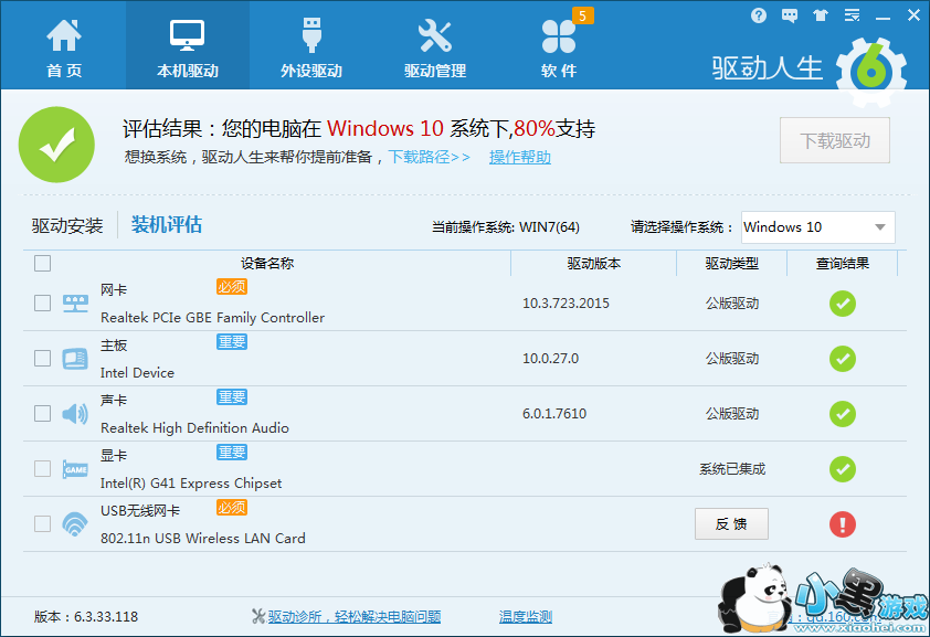 当你的电脑被驱动人生评估为只有80%支持Win10时,你可以不必在意。此种情况下,你将系统升级为Win10,驱动人生能帮你将所有驱动都安装好。