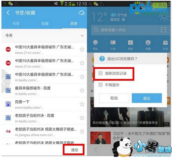 手机虽然是一个很隐私的设备,但是注意保护自己的隐私也是很必要的。浏览一些网页的时候,想及时清理掉“浏览记录”,只需要在推出UC浏览器的时候,勾选“清除浏览记录”即可。或者在“书签/收藏->历史”里面点击“清空”。