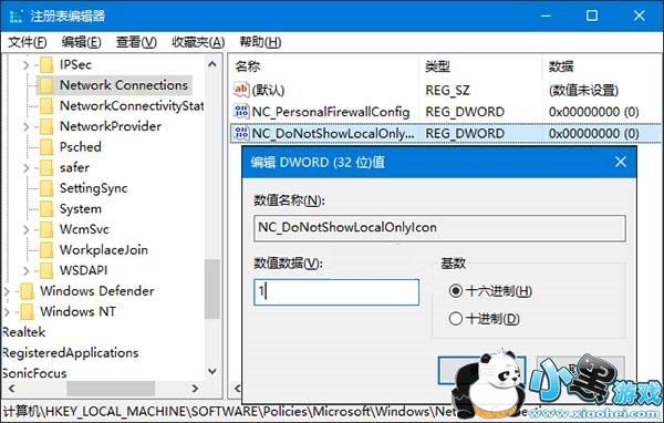 在右侧新建名为NC_DoNotShowLocalOnlyIcon的DWORD值,双击将其值修改为1即可;