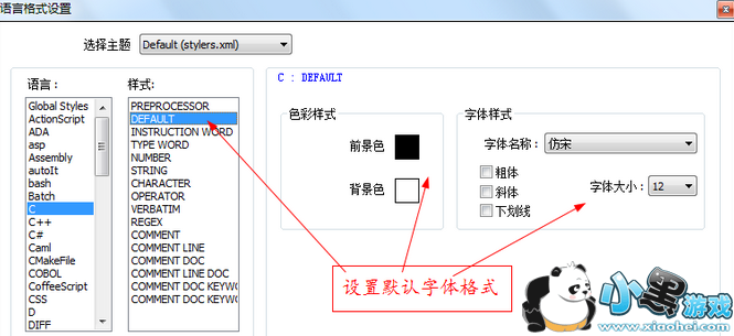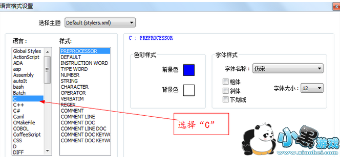 2、选择“语言格式设置”后,系统会自动弹出语言格式设置对话框。接下来我们选择“C”表示我们将对.c格式的文件进行设置,具体操作情况如下图所示