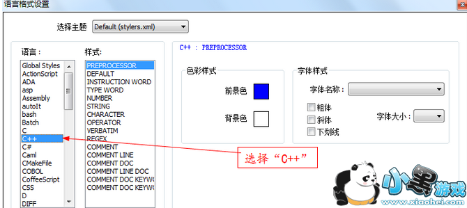 1、关于在.h文件中字体格式的设置,关键字啊、数字啊、注释之类的,设置方法都和上面介绍的一样,我就不再赘述了。唯一不同的是,在语言格式设置对话框中的“语言”那一栏我们选择“C++”而不是“C”。具体情况如下图所示
