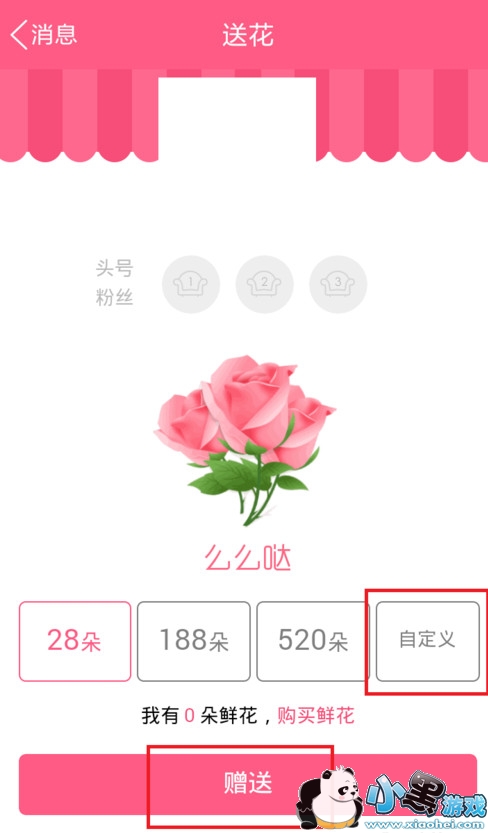 QQ群成员选择完毕之后,我们就可以输入送花的数量啦,由于不同的送花数量有不同的含义,像1314、520等数字都有特别的含义,可以供大家去选择。所以这里我们选择“自定义”按钮。