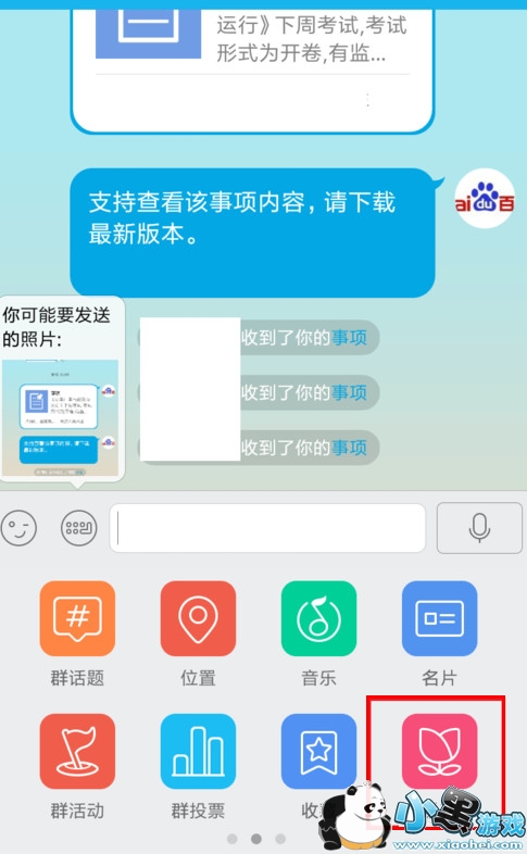 在该QQ群聊天主页面中,点击聊天窗口中的“+”按钮,打开聊天窗口菜单页面,在菜单页面中,点击选择“送花”功能。