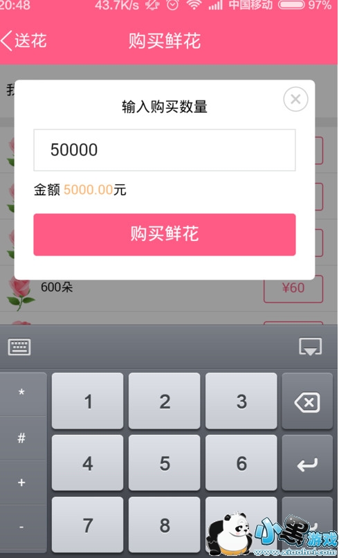 接下来弹出的界面就是鲜花的购买页面,在该页面中我们可以输入需要购买鲜花的数量,但是系统限制一次购买鲜花所花的RMB不超过5000,意味着一次只能买5000朵鲜花。