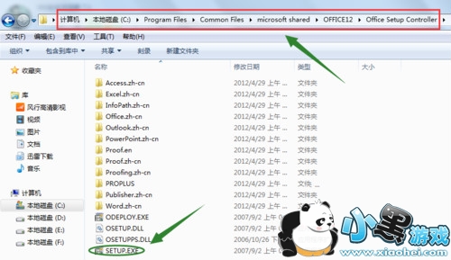 1、双击电脑C盘,接着依次打开下面的文件夹“我的电脑”—“C盘”—“Program Files/Common Files/Microsoft Shared/OFFICE12/Office Setup Controller”,在里面找到一个名为“SETUP.EXE”的应用程序,如下图: