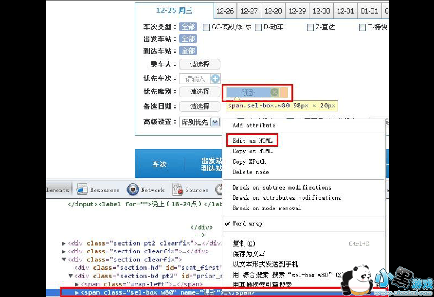 注:使用一款非IE浏览器360安全浏览器或者搜狗也行,登陆到12306官网,选择好车次进入订票页面,可以发现在席别一栏的下拉框中只有“硬座”、“硬卧”、“软卧”三个选项。选择硬卧,在硬卧区域,单机鼠标右键->点击“审查元素”可以调出页面前段代码。(提示:一定要在硬卧栏里点击右键,审查元素,这能能直接跳到我们需要的代码那里),我们把默认选中的这一行代码展开,右键-点击“Edit as HTML”,在弹出的编辑框中, 代码后面直接下面加入这段代码(图示教程如下)