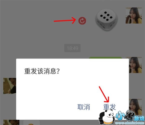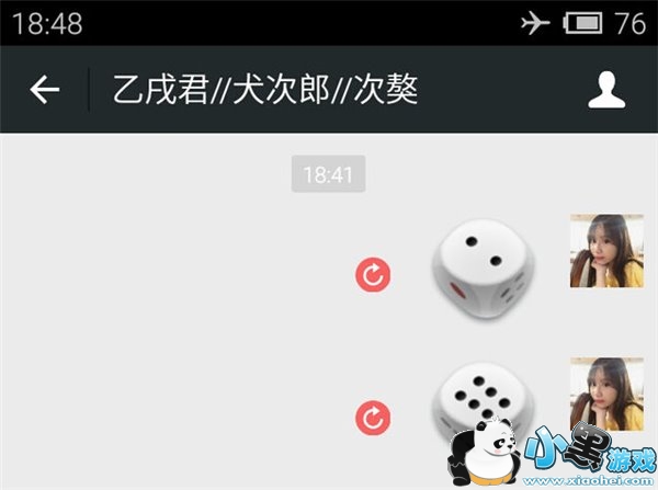 等全部骰子都被标志红色箭头圈圈时,关闭飞行模式,像别人发起玩骰子挑战吧!他摇出5点,你就从刚才发送失败的骰子中选一个6点的,点击红色箭头圆圈标志,确认重新发送。这样一来,对方那边就会在他的5点骰子之后,显示出你发送的6点的骰子。