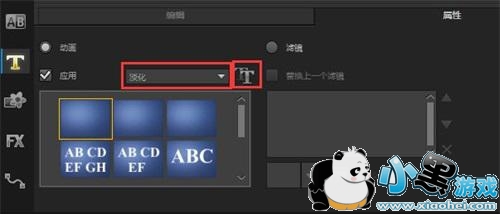 3、文字输入完成之后,再给文字加上动画。双击文字,点击选项,切换到属性栏,点击动画,勾选“应用”。在“选取动画类型”选择动画类型,如图1所示,然后点击后面的“T”自定义动画属性,调整字幕的效果,如图2所示。