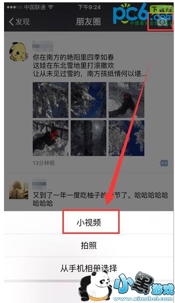 1、首先打开微信朋友圈,点击界面右上角的“相机”图标,在底部弹出的菜单中,选择“小视频”;